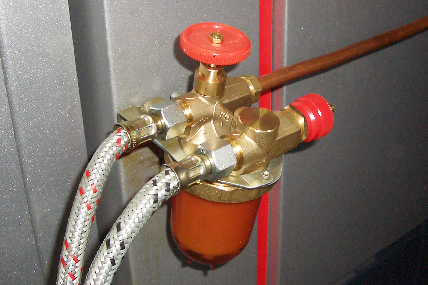 Vor jedem Ölkessel ist ein Vorfilter in die Ölleitung eingebaut, bei einigen Ölkesseln ist er bereits werkseitig im Kesselgehäuse montiert. Um Arbeiten am Ölfilter durchführen zu können, gibt es davor oder in den Filter integriert eine Absperreinrichtung. Der Vorfilter muss mit einer Halterung fest installiert sein.[/vc_column_text]